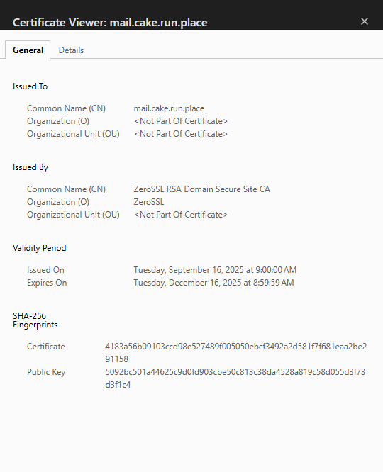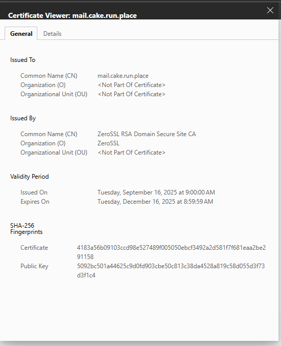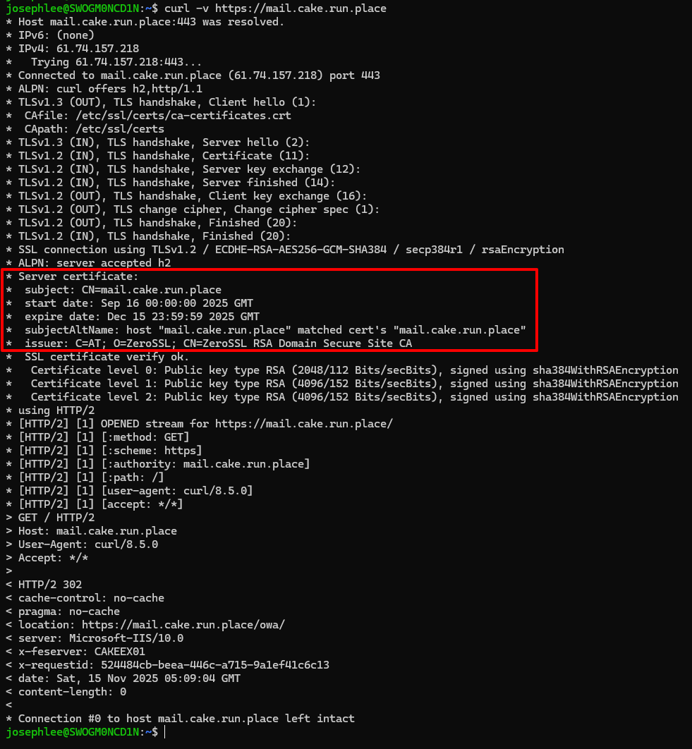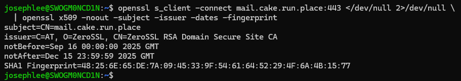 openssl s_client -connect mail.cake.run.place:443 </dev/null 2>/dev/null \