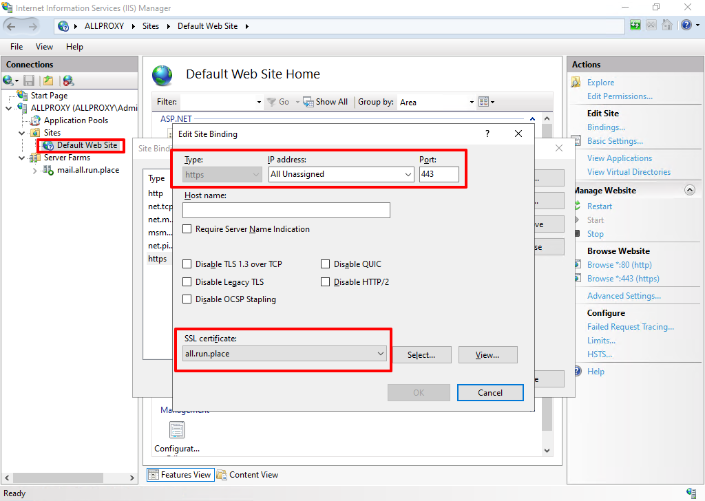 And go to “IIS manager > Sites > Default Web Site > Bindings > https > Edit”.