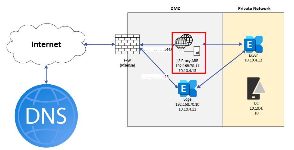 For the exchange server, almote every clients will need to seperate the network traffic with 443 and 25. In this case, they need reverse proxy. I will use IIS ARR(Application request routing) service as an proxy server. So, here is the a diagram which shows you the architecture of the LAB for this post.