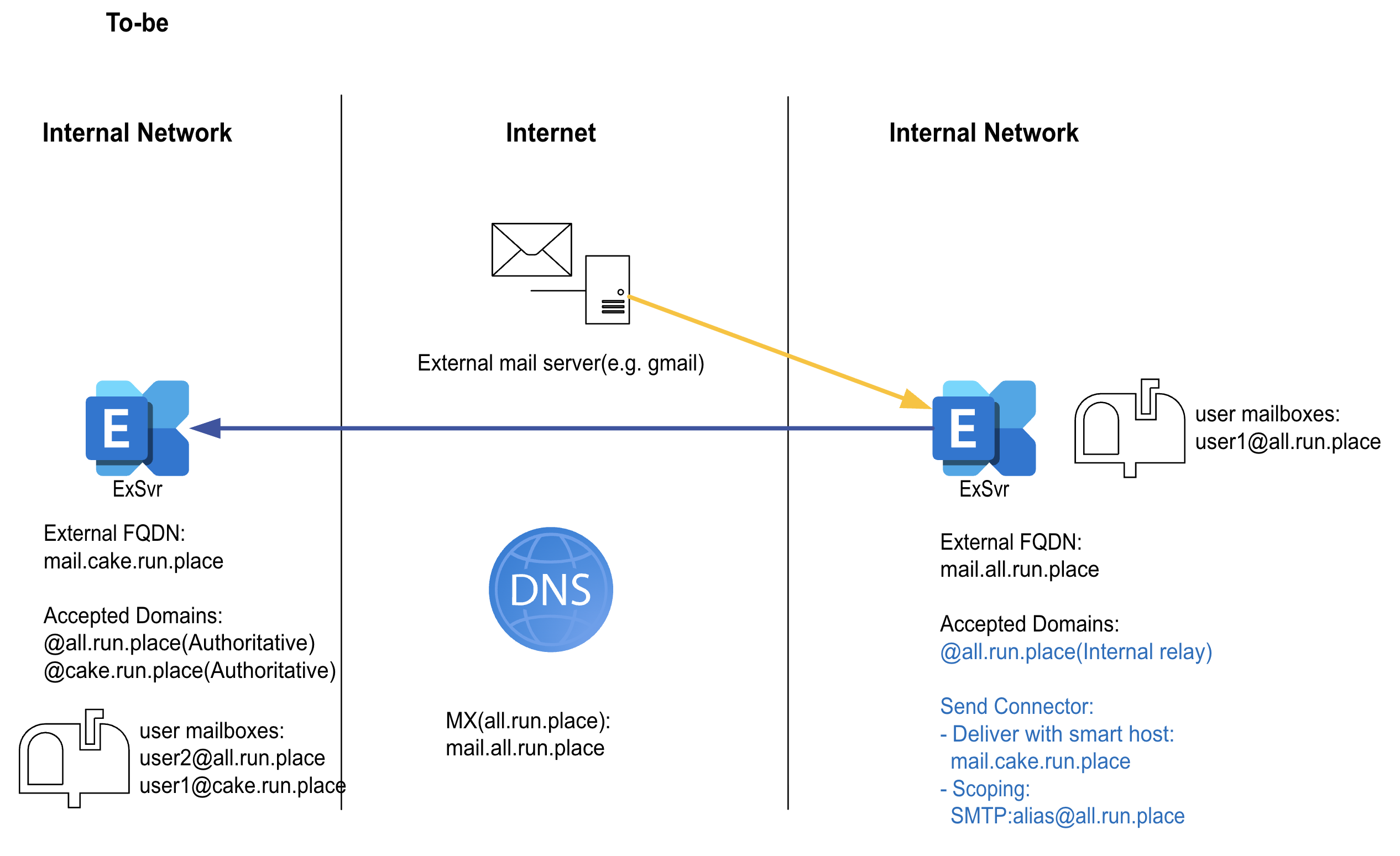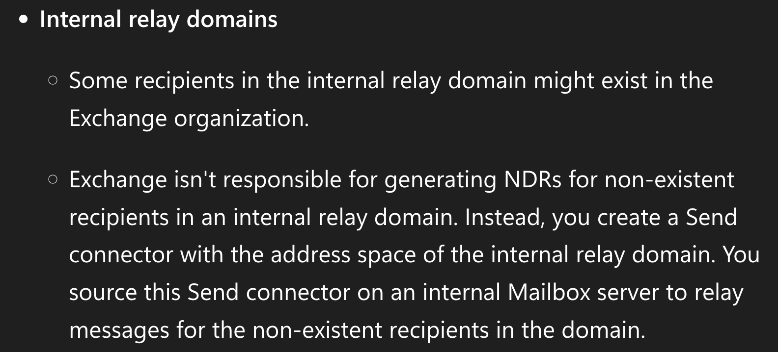 If we set the domain as internal relay, this means, “Some recipients in the internal relay domain might exist in the Exchange organization.”